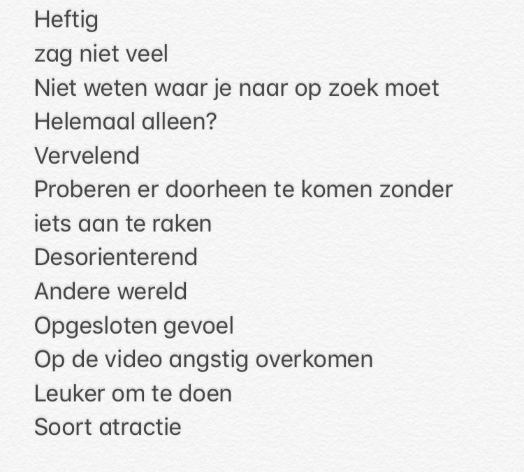 Wat opvalt is dat iedereen het wel heftig en desoriënterend vindt maar ze het ook allemaal iets van een attractie weg vinden hebben. Dit is niet het gevoel is waar we naar opzoek zijn. Omdat ze ook zeiden dat vooral het licht, geluid en kleuren het meeste effect hadden ga ik kijken of ik daar los iets mee kan.